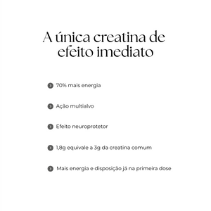 A única creatina do mercado com efeito imediato. Explosão e desempenho físico, garantindo suporte eficaz para treinos intensos.